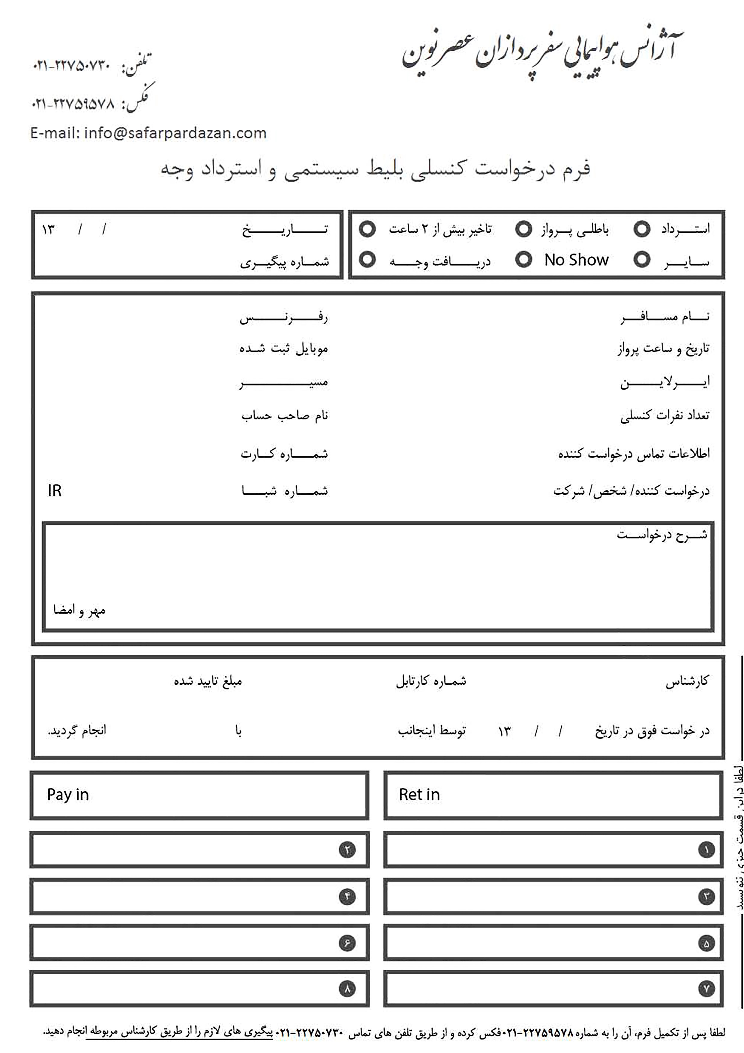 آژانس هواپیمایی سفر پردازان عصر نوین با هدف ارائه خدمات الکترونیکی در صنعت گردشگری و سهولت درخرید،سایت فروش آنلاین بلیط سیستمی(تعرفه دولتی)ایران را طراحی و پیاده سازی نموده است.مسافر گرامیدر هر کجا که باشید می توانید با یکبار ثبت نام در سایت آژانس در قسمت خرید آنلاین بلیط هواپیما علاوه بر تخفیف به پنل اختصاصی خود وارد شده و لیست بلیط های را که خریداری نمودید رامشاهده و کنترل نمایید.آژانسهای همکار می توانند نسبت به ثبت نام و ارسال کپی مجوز از کمیسیونبهره مند شوند.تنها با چند کلیک ساده در طول شبانه روز بلیط خود را یا آرامش و مطمئن خریداری ،چاپ،یا از طریق ایمیل ،و پنل اختصاصی دریافت نمایید..با خرید بلیط هواپیما از آژانس هواپیمایی سفر پردازان عصرنوین، آرامش و آسودگی خود را در طول سفر تضمین و با خیال راحت مسافرت کنید.